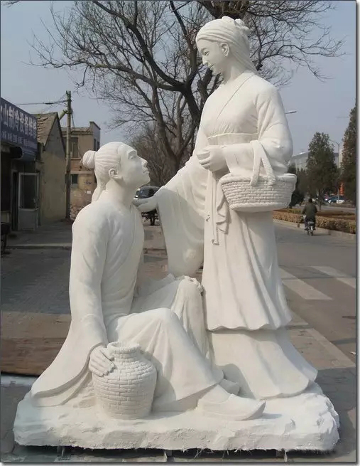 其實我更喜歡制作成功的玻璃鋼雕塑作品,漂母的優雅婉約,嫻靜恬淡,眼神中的憐惜與鼓勵,都在一顰一笑一個衣褶一個提動態中體現,仿真石材的效果讓韓信的體態更顯堅實,所說是落難英雄,看到韓信仰望漂母的感覺,感恩之心悠然而生,或許這就是此雕塑所表現的真實意義吧。漂母韓信玻璃鋼雕塑最終的安放地點是淮安的一所中學,仰望古人,心懷感恩,后世不忘前世之師,念卻先閑展望未來,懷古論今繼往開來。